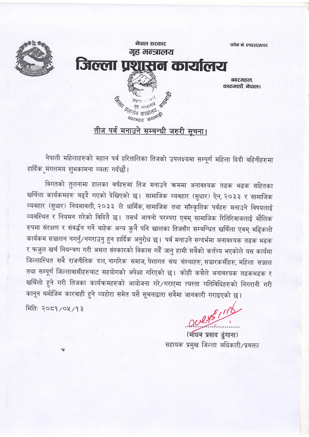 प्रशासनले बिहीबार एक सूचना जारी गर्दै आफ्नो परम्परा एवं सामाजिक रितिरिवाजलाई मौलिक रुपमा संरक्षण र सम्वर्द्धन गर्ने बाहेक अन्य तीजसँग सम्बन्धित खर्चिला र भड्किला कार्यक्रम सञ्चालन नगर्न आग्रह गरेको हो । साथै, प्रशासनले अनावश्यक तडकभडक र खर्चिलो हुने गरी तीजका कार्यक्रम आयोजना गरेमा निगरानी गरी कानुनअनुसार कारबाही हुने स्पष्ट गरेको छ ।