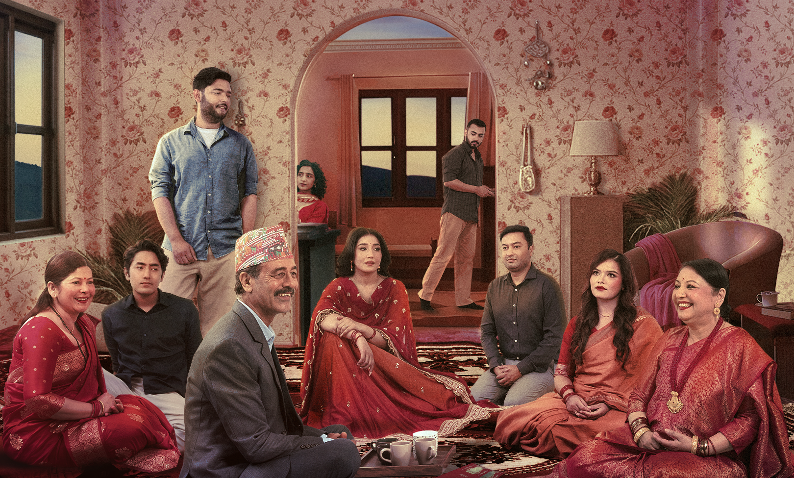 पोस्टरको केन्द्रमा आँचल शर्मा छन् भने उनको वरिपरि परिवारका सदस्यहरू बसेका छन् । घर भित्र सजिएको अवस्थामा रहेका उनीहरूको लवाइले कसैलाई स्वागत गर्न पर्खेझैँ देखिन्छ । यो पोस्टरले त्यो क्षण समात्छ, जब पाहुनाहरू आउनुअघि सबै जना तयार भएर बसिरहेका हुन्छन् । तर पाहुनाहरूले घरभित्र पस्दा, उनीहरूले मात्र घर होइन, घरभित्रका कुराकानी र मौनता पनि देख्छन् ।